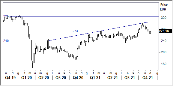 L'indice Stoxx Oil & Gas (oggi 273 punti) ha messo a segno sei settimane di ribasso consecutive, tornando sui livelli di metà settembre, per le preoccupazioni sollevate dalla diffusione del contagio. La correzione è partita prima della scoperta dell variante Omicron. Il cedimento di area 274 punti ha rappresentato una prima allerta dal punto di vista grafico, come si evidenzia nell'immagine sotto, con rischi di ulteriori discese verso il sostegno di lungo periodo in area 240 punti.