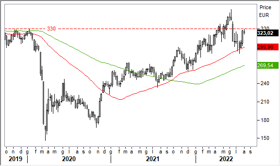 Operatività. Rafforziamo la visione positiva. Sfruttare la fase di assestamento in corso per comprare sulla debolezza. Sfruttare estensioni nel range 375/382 punti per prendere profitto. Applicare uno stop loss prudenziale in caso di chiusura sotto 300 punti.