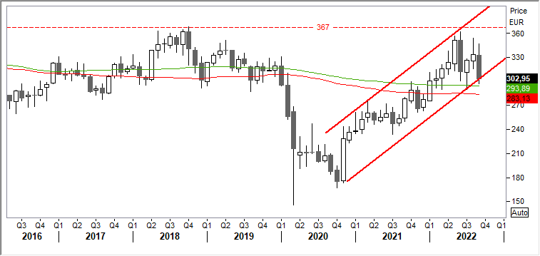 La caduta di settembre ha riportato i valori a ridosso della parte bassa del canale nonchè a ridosso delle due medie mobili di lungo termine, che oggi transitano in area 293/283 punti.