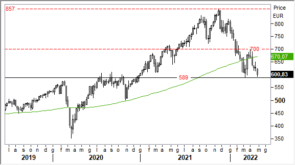 La discesa ha portato i valori a ridosso dei minimi dell'anno (589 punti), primo sostegno di rilievo che potrebbe frenare le vendite e avviare un rimbalzo come già accaduto a metà marzo. In caso di insuccesso, il cedimento di area 589 potrebbe spingere l'indice verso il successivo supporto a 560 punti.