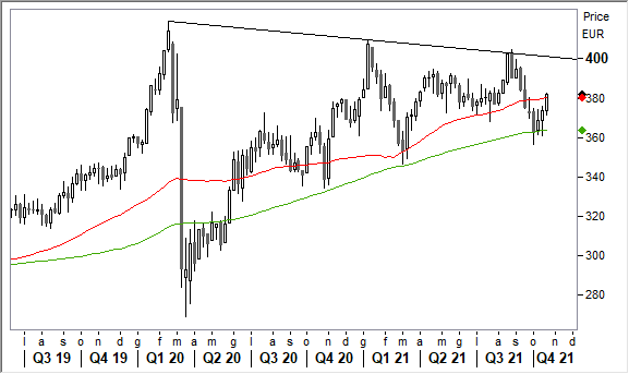 L'indice Stoxx Utility (oggi 381 punti) si porta sui massimi da un mese, ma è tra i pochi a non essere ancora riuscito a tornare sopra i livelli del marzo 2020, sfiorati in un paio di occasioni nel periodo successivo. La prima resistenza è verso la media mobile indicata in rosso, passante oggi intorno ai 380 punti, oggi sotto attacco.