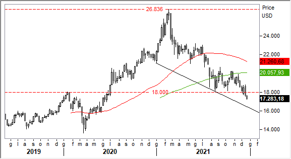 L'impostazione grafica dell'indice FTSE China 30/18 Capped (oggi 17.238) è ribassista a partire dal febbraio di quest'anno. Dal picco in area 26.800 punti ha perso circa un terzo del suo valore. Nell'ultima settimana ha ceduto il forte supporto in area 18mila, massimo del 2019, aprendo la strada a una potenziale discesa fino a 16mila punti. Segnali di forza sono attesi in caso di ritorno sopra 20mila punti ovvero al superamento della media mobile di lungo periodo evidenziata in verde nell'immagine sotto.