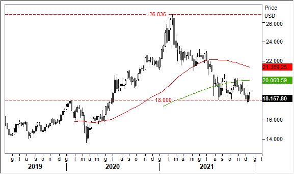 L'impostazione grafica dell'indice FTSE China 30/18 Capped è impostato al ribasso dal febbraio di quest'anno. Dal picco in area 26.800 punti ha perso circa un terzo del suo valore. Negli ultimi tre mesi ha avviato però una fase laterale, che riteniamo propedeutica a una ripartenza, con forte supporto in area 18mila, precedente picco record di fine 2019. Segnali di forza sono attesi in caso di ritorno sopra 20mila punti ovvero al superamento della media mobile di lungo periodo evidenziata in verde nell'immagine sotto.