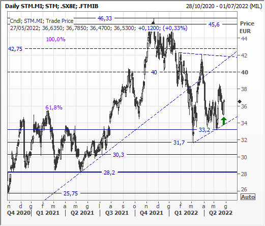 Scenario grafico di breve-medio periodo. Stm, ora a 36,5 euro (+0,4%). Dai massimi ventennali a 46,33 euro segnati lo scorso novembre ai minimi raggiunti a marzo a 31,7 euro, il ritracciamento è stato del 31%: ampio ma non tale da modificare la tendenza rialzista di fondo. Ribadiamo che l'elevato ipervenduto e la consistenza della fascia supportiva raggiunta (34/31-28 euro) giustifica reazioni significative, e magari anche il ritorno sui top.