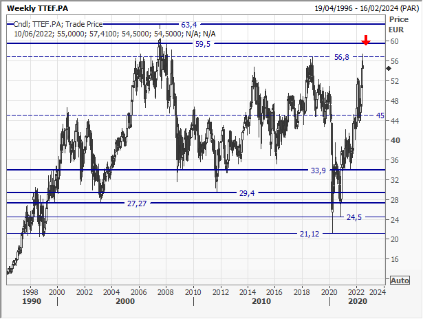 Scenario grafico di breve-medio periodo. TotalEnergies , ora a 54,1 euro (-0,7%). Dai minimi segnati in piena pandemia a 21,12 euro, il rally culminato sui top di questa settimana a 57,4 euro ha accumulato un guadagno del 172%. Così facendo, i prezzi si sono ritportati sulla parte superiore della ventennale banda di oscillazione 20/30 - 56/64 euro. Storicamente, questa è sempre stata un'ottima occasione per alleggerire il titolo.