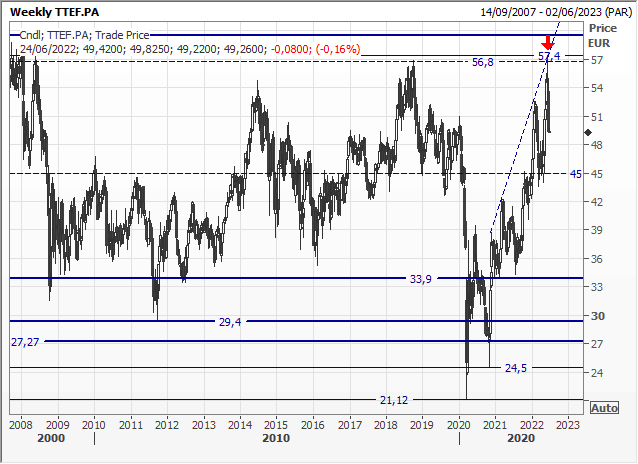 Scenario grafico di breve-medio periodo. TotalEnergies , ora a 49,3 euro (-0,1%). Dai minimi segnati in piena pandemia a 21,12 euro, il rally culminato sui top toccati a giugno a 57,4 euro ha accumulato un guadagno del 172%. Così facendo, i prezzi si sono ritportati sulla parte superiore della ventennale banda di oscillazione 20/30 - 56/64 euro. Storicamente, questa è sempre stata un'ottima occasione per alleggerire il titolo.