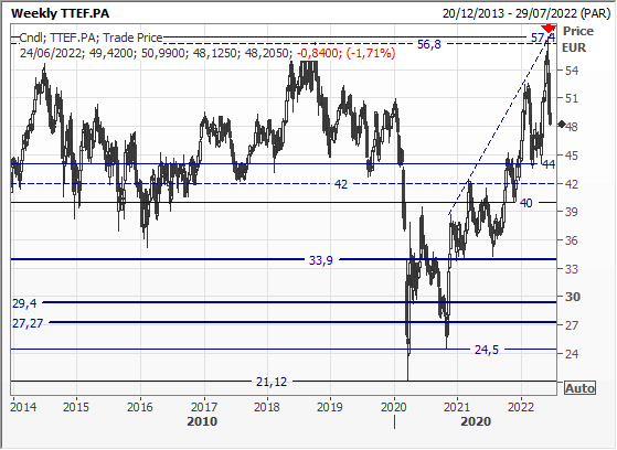 Scenario grafico di breve-medio periodo. TotalEnergies , ora a 48,2 euro (-1,7%). Dai minimi segnati in piena pandemia a 21,12 euro, il rally culminato sui top toccati a giugno a 57,4 euro ha accumulato un guadagno del 172%. Così facendo, i prezzi si sono riportati sulla parte superiore della ventennale banda di oscillazione 20/30 - 56/64 euro. Storicamente, questa è sempre stata un'ottima occasione per alleggerire il titolo, e sembra anche questa volta.