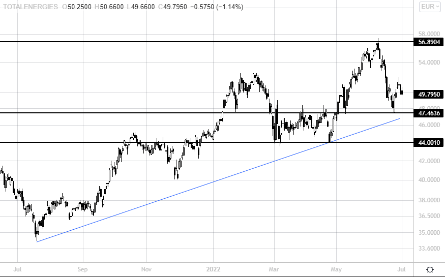 Scenario grafico di breve-medio periodo. TotalEnergies , oggi a 49,7 (-1,3%). Dai minimi segnati in piena pandemia a 21,12 euro, il rally culminato sui top toccati a giugno a 57,4 euro ha accumulato un guadagno del 172%. Così facendo, i prezzi si sono riportati sulla parte superiore della ventennale banda di oscillazione 20/30 - 56/64 euro. Storicamente, questa è sempre stata un'ottima occasione per alleggerire il titolo, e sembra anche questa volta. Come da programma, dopo aver segnato due doji di fila a indicare esaurimento del rimbalzo il titolo ha avviato la discesa.