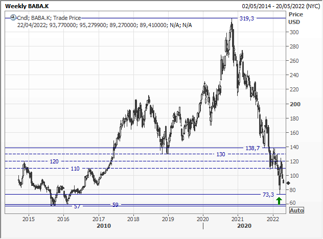 Scenario grafico di breve-medio periodo. Alibaba, ora a 90 usd (+0,6%) nel pre-market, da -4,4% di ieri. Il downtrend è in corso da 319,3 usd, record assoluti dell'ottobre 2020, raggiungendo un minimo di periodo a marzo a 73,3 usd. La successiva reazione è stata veemente ma è stata respinta dalle prime resistenze - degne di nota - intorno a 120/124 usd. I prezzi stanno tornando sui minimi che si sono rivelati buona base d'acquisto.