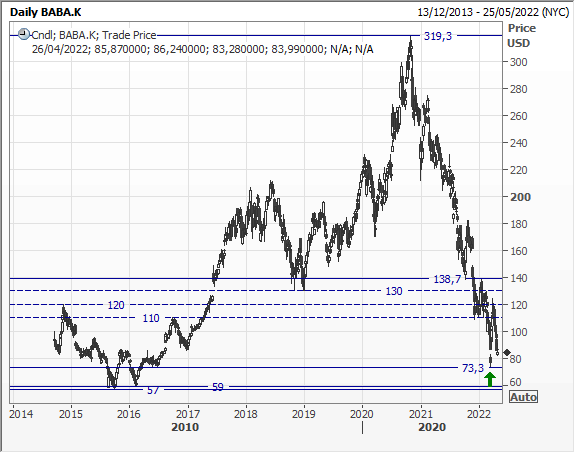 Scenario grafico di breve-medio periodo. Alibaba ora scambia a 85,6 usd, +2,1%, nel pre market, dopo aver chiuso in ribasso del 2,2%. Il downtrend è in corso da 319,3 usd, record assoluti dell'ottobre 2020, raggiungendo un minimo di periodo a marzo a 73,3 usd. La successiva reazione è stata veemente ma è stata respinta dalle prime resistenze - degne di nota - intorno a 120/124 usd. I prezzi stanno tornando sui minimi che si sono rivelati buona base d'acquisto.