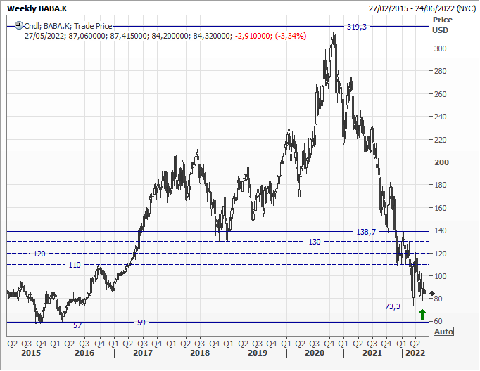 Scenario grafico di breve-medio periodo. Alibaba ora scambia a 83,2 usd, -4,6%. Il downtrend è in corso da 319,3 usd, record assoluti dell'ottobre 2020, raggiungendo un minimo di periodo a marzo a 73,3 usd, valori riavvicinati la scorsa settimana, dopo un'effimera reazione fino a 124 usd. Il trend rimane debole e vulnerabile, ma la fascia di prezzo che va da qui a 57 usd è zona d'accumulo. Obiettivi in zona 120/124 usd, con spartiacque sopra 140 usd.