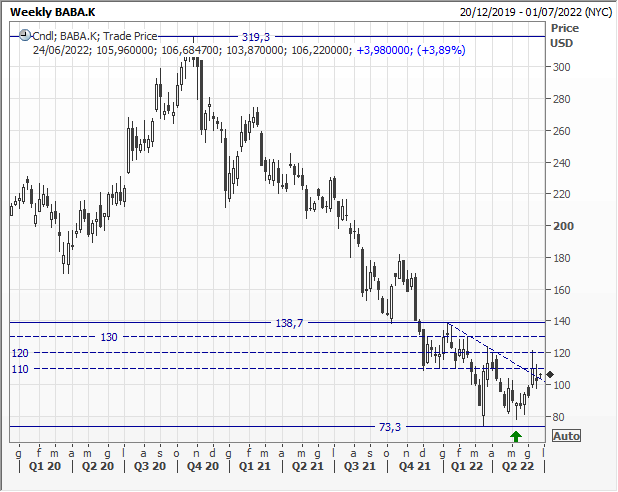 Scenario grafico di breve-medio periodo. Alibaba ora a 106 usd, +3,7%. Il downtrend è in corso da 319,3 usd, record assoluti dell'ottobre 2020, raggiungendo un minimo di periodo a marzo a 73,3 usd, valori riavvicinati anche successivamente, dopo un'effimera reazione fino a 124 usd. Il trend rimane debole e vulnerabile, ma la fascia di prezzo che va da qui a 57 usd è zona d'accumulo. Obiettivi minimi in zona 120/124 usd, con spartiacque sopra 140 usd.