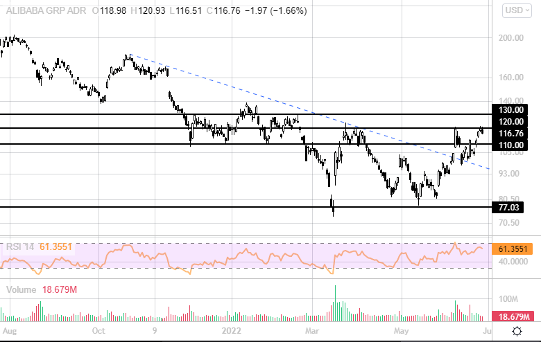 Scenario grafico di breve-medio periodo. Alibaba ora a 116,97 usd, +0,2% nel Pre-Market, dopo aver chiuso ieri in ribasso del 1,66%. Il downtrend è in corso da 319,3 usd, record assoluti dell'ottobre 2020, raggiungendo un minimo di periodo a marzo a 73,3 usd, valori riavvicinati anche successivamente, dopo un'effimera reazione fino a 124 usd. Il trend rimane debole, anche se in fase di consolidamento da qualche mese, ma la fascia di prezzo che va da qui a 57 usd è zona d'accumulo. Obiettivi minimi in zona 120/124 usd (già raggiunti ieri), con spartiacque sopra 140 usd.