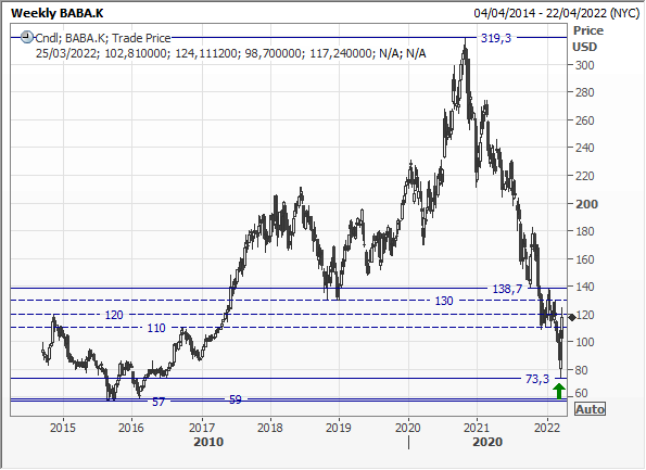 Scenario grafico di breve-medio periodo. Alibaba, ora a 116,5 usd (-0,6%) nel pre-market dopo il +2% di ieri. I prezzi hanno raggiunto un nuovo minimo di periodo la scorsa settimana a 73,3 usd, e da lì è partito un energico rimbalzo. Il downtrend è in corso da 319,3 usd, record assoluti dell'ottobre 2020. La vicinanza ai minimi del 2015/2016, area 60 usd, aumenta significativamente le possibilità che la tendenza ribassista sia vicina all'esaurimento, e i primi segnali di reazione già si vedono. Segnali di rafforzamento del rimbalzo sopra 140 usd.