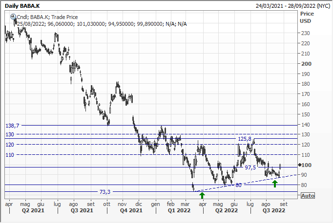 Scenario grafico di breve-medio periodo. Alibaba, ora a 101,6 usd (+1,8%). Il downtrend è in corso da 319,3 usd, record assoluti dell'ottobre 2020, raggiungendo un minimo di periodo a marzo a 73,3 usd. Da allora prevale una fase di assestamento all'interno della banda 73/80 - 120/125 usd. Segnali favorevoli a spinte rialziste più solide andranno letti sopra 140 usd.