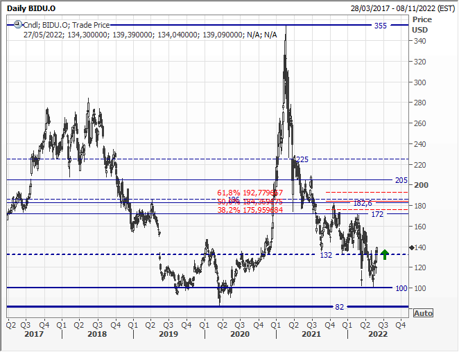 Scenario grafico di breve-medio periodo. Baidu, ora nel pre-market quota 148,5 usd, +6,8%, dopo aver chiuso venerdì con un rialzo del 2,1%. Dai top assoluti segnati nel febbraio 2021 in zona 355 usd, i prezzi sono crollati fino a 100 usd quest'anno, area testata 2 volte prima di reagire. Il superamento della fascia 132/140 usd dovrebbe favorire estensioni verso 180/200 usd.
