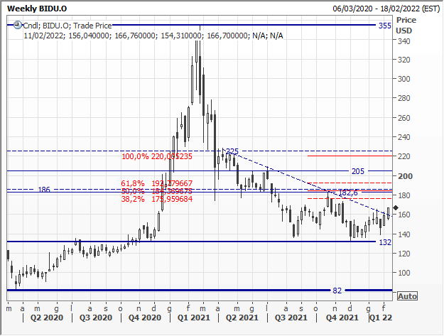 Scenario grafico di breve-medio periodo. Baidu, ora nel pre-market a 165 usd, -0,8%, ha ritracciato violentemente dai top assoluti segnati nel febbraio 2021 in zona 355 usd. I movimenti di dicembre e gennaio ha dimostrato il riconoscimento dei forti supporti in area 140 usd. A questo punto aumentano le chances di assistere ad una reazione rialzista, anche forte: resistenze significative nella fascia 200/225 usd.