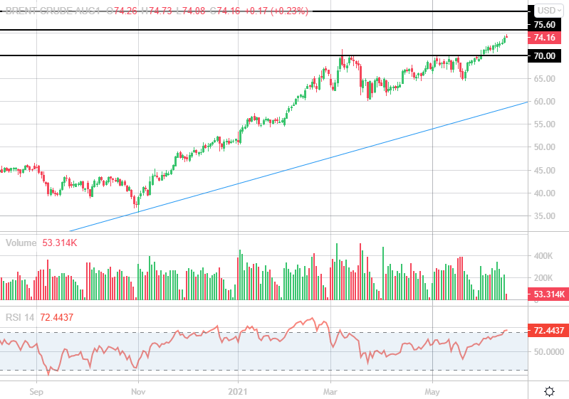 Scenario grafico di breve-medio periodo. Brent, ora a 74,16 usd. Il Brent ha infranto un'importante resistenza nella fascia di prezzo 72/73 usd e ora mette nel mirino la fascia dei 75 usd.