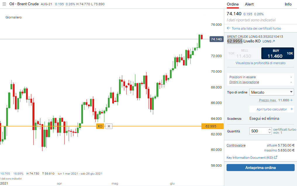 TRADING Turbo24 - LONG su Brent con Knock Out a 62,9955 dollari
