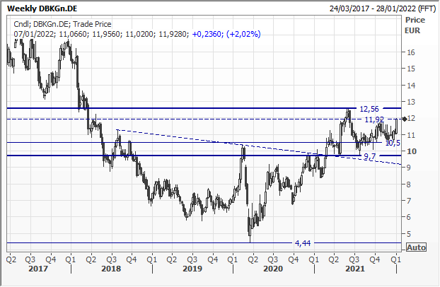 Scenario grafico di breve-medio periodo. D. Bank, ora a 11,9 euro, +2%, sta consolidando da qualche mese il recupero partito dai minimi di inizio pandemia a 4,44 euro. Crediamo sia una situazione temporanea prima di riprendere a spingere. Nel frattempo operiamo all'interno della banda 9,7/10,5 - 11,92/12,5 euro.