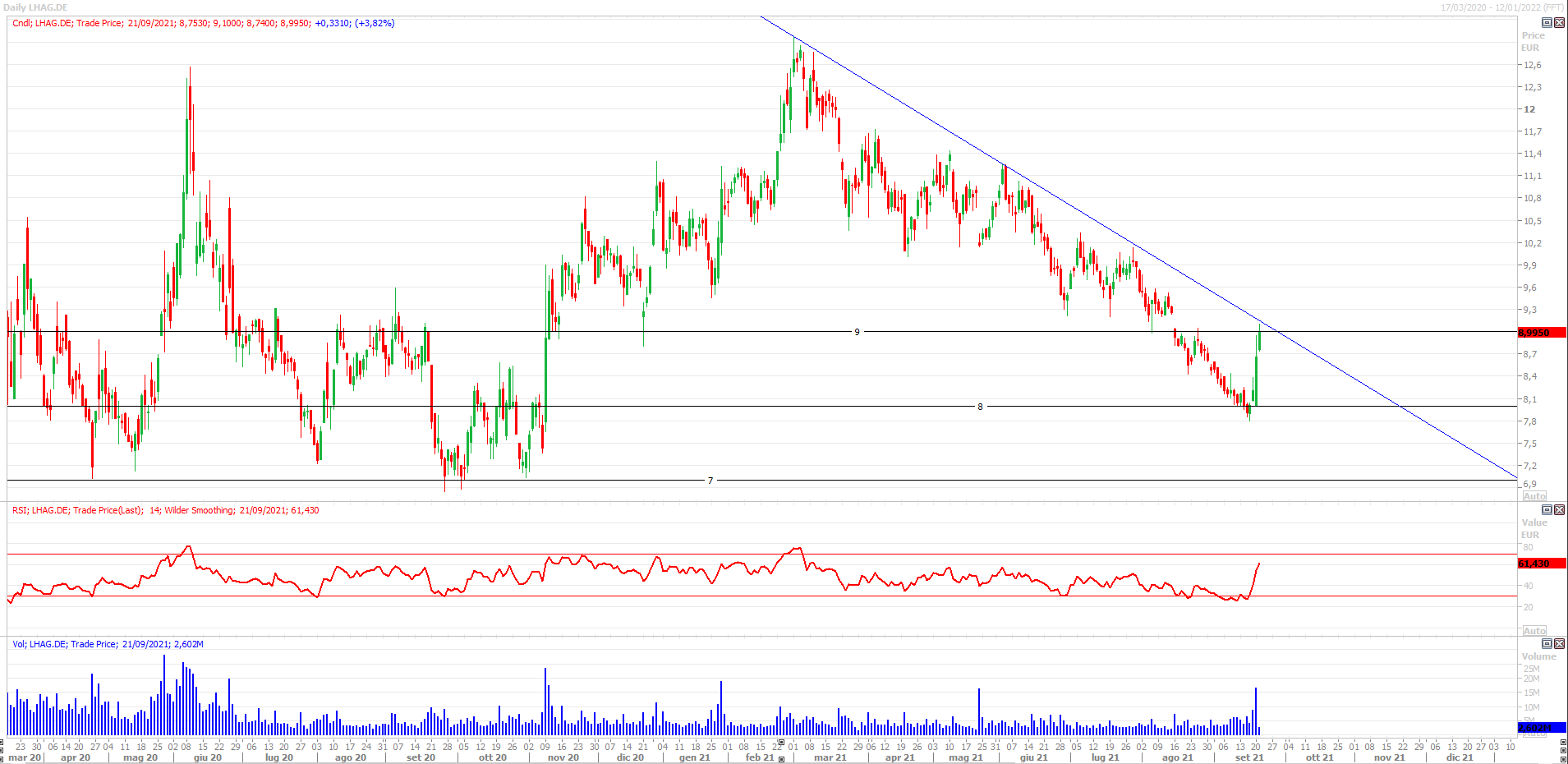 Scenario grafico di breve-medio periodo. Deutsche Lufthansa, ora in rialzo circa del 4,1% a 9 euro, cerca il rimbalzo dagli 8 euro, dopo una fase di calo avviata sui massimi di marzo in area 13 euro. Volumi e momentum accompagnano il movimento che necessita ora di una conferma con il breakout in forza di area 9 euro e della trend line ribassista costruita sui massimi di marzo e giugno 2021. In caso di rottura nel mirino i 9,6 euro e successivamente i 10 euro.