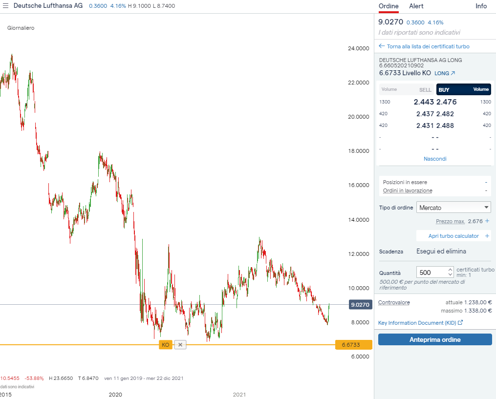 TRADING Turbo24 - LONG su DEUTSCHE LUFTHANSA con Knock Out a 6,6733 eur