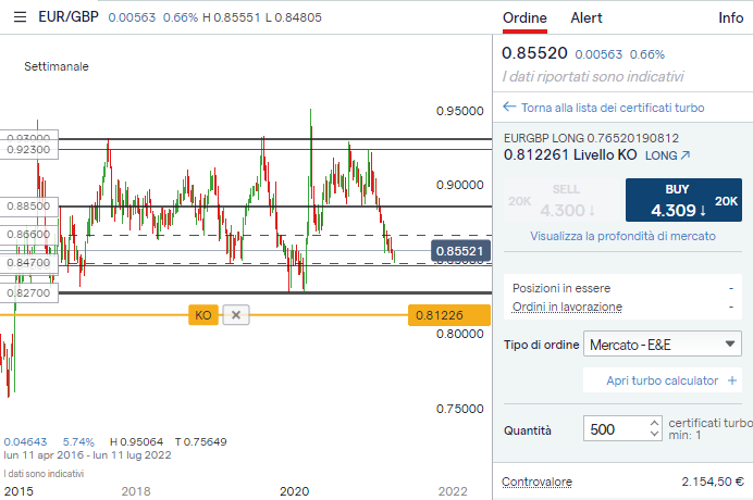 TRADING Turbo24 - LONG SU EUR/GBP con Knock Out a 0,812261 punti