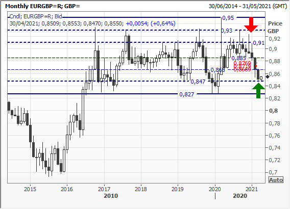 Scenario grafico di breve-medio periodo. EuroSterlina, ora a 0,854 punti +0,5%. L'euro-sterlina ha chiuso il quinto mese di ribasso consecutivo. Il cross è tornato sulla parte bassa della banda di oscillazione che dura da metà 2016: 0,827/0,85 - 0,9/0,95. Da quest'area ha sempre invertito tendenza.