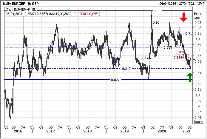 Scenario grafico di breve-medio periodo. EuroSterlina, ora a 0,863 punti -0,1%. L'euro-sterlina ha chiuso il quinto mese di ribasso consecutivo. Il cross è tornato sulla parte bassa della banda di oscillazione che dura da metà 2016: 0,827/0,85 - 0,9/0,95. Da quest'area ha sempre invertito tendenza, e i primi segnali già si vedono.