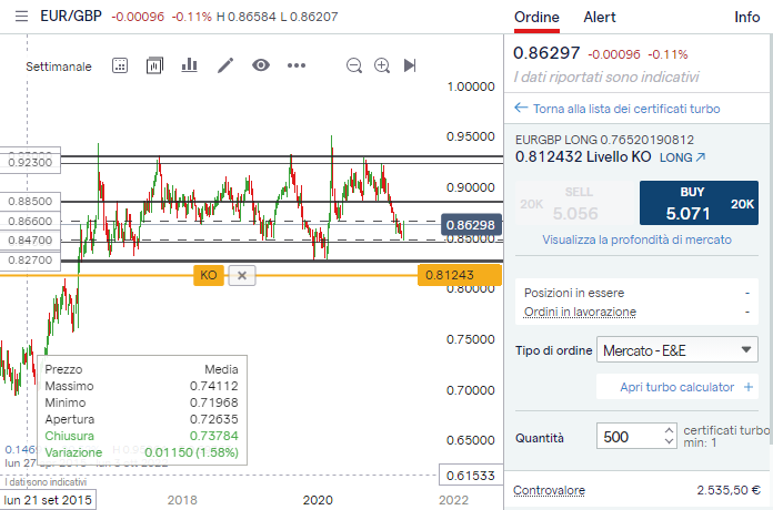 TRADING Turbo24 - LONG SU EUR/GBP con Knock Out a 0,812432 punti