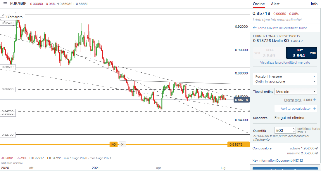 TRADING Turbo24 - LONG su EUR/GBP con Knock Out a 0,818726
