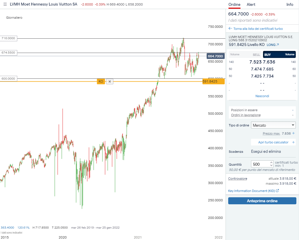 TRADING Turbo24 - LONG su LVMH con Knock Out a 591,8425 euro