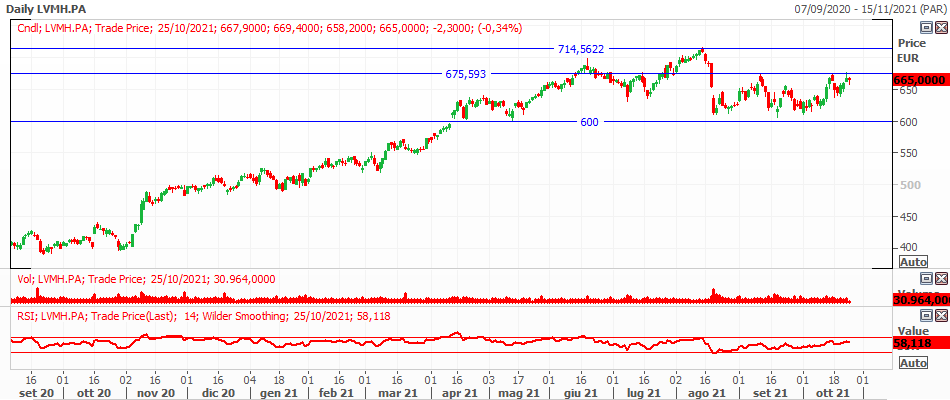 Scenario grafico di breve-medio periodo. Lvmh, ora a 664,5 euro, -0,4%, è in poderoso uptrend dal 2009. Dopo aver segnato il top assoluto a 716,6 euro è prevalsa una fase di ritracciamento/consolidamento con base a 600 euro. Pensiamo che questo movimento in banda, parte superiore rappresentata dai massimi, proseguirà ancora per un po'.