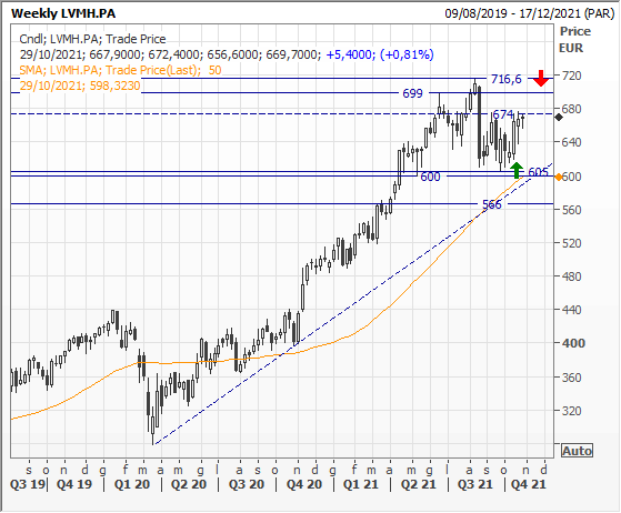 Scenario grafico di breve-medio periodo. Lvmh, ora a 670 euro, +0,8%, è in poderoso uptrend dal 2009. Dopo aver segnato il top assoluto a 716,6 euro è prevalsa una fase di consolidamento con base a 600 euro. Pensiamo che questo movimento in banda, parte superiore rappresentata dai massimi, proseguirà ancora per un po'.