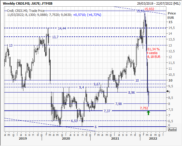 Operatività multiday: a questi prezzi, e in caso di flessioni verso l'ampia fascia 8-6 euro, suggeriamo anche oggi operazioni scalettate LONG su UNICREDIT con Knock Out a 5,637095 euro, fattore di leva 3X, con il certificato disponibile sulla piattaforma IG.