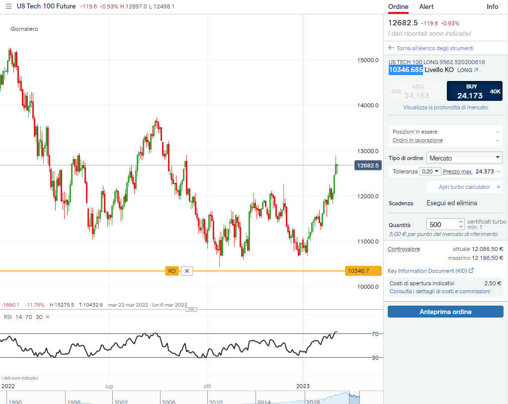 TRADING Turbo24 - LONG su US TECH 100 con Knock Out a 10.346,685 usd