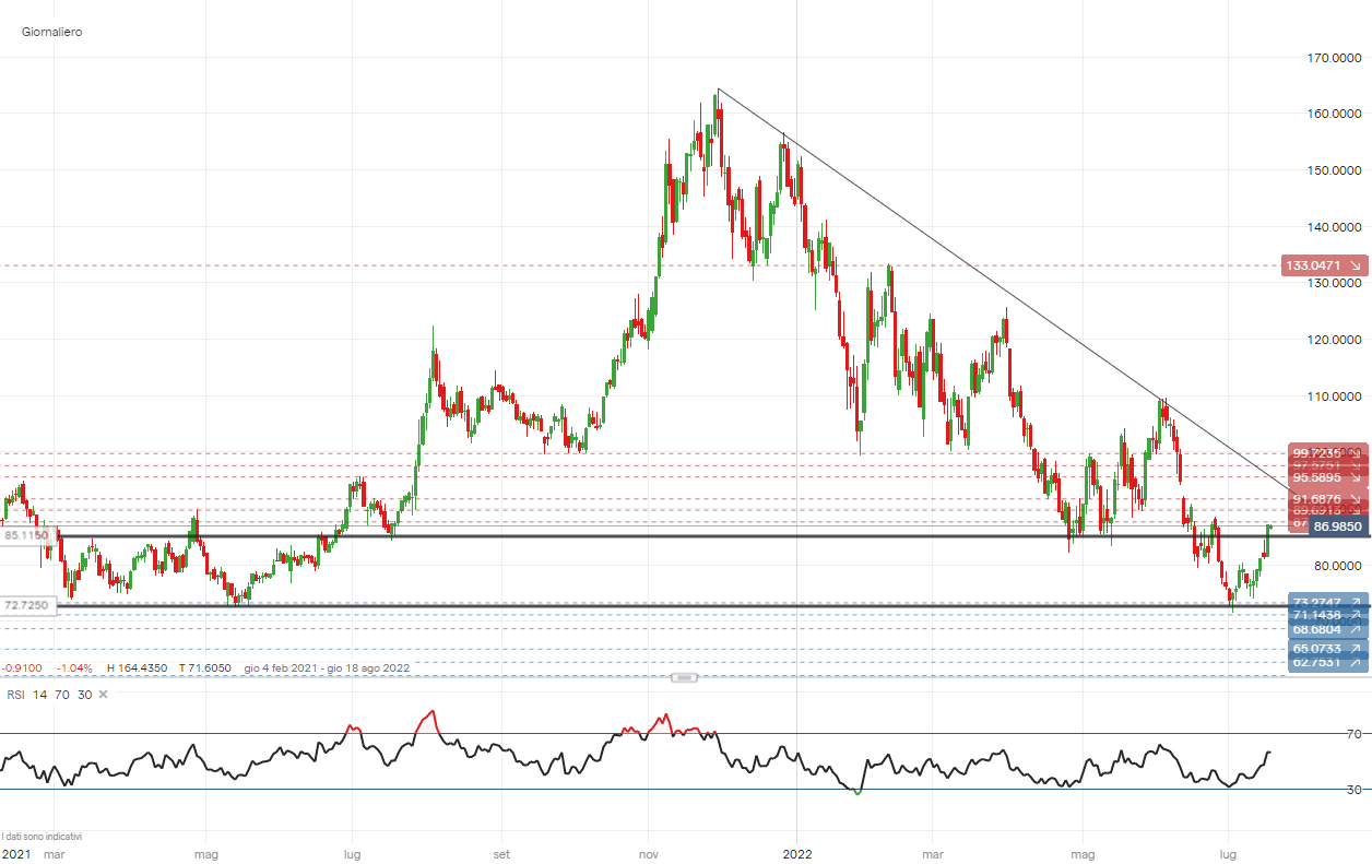 Scenario grafico di breve-medio periodo. Tra 74 e 72 usd si trova un supporto chiave che fin dal 2020 ha tenuto respingendo verso l'alto i prezzi. Il primo target a 85 usd è stato preso ma il quadro rimane favorrevole per portare a 90 usd l'operatività. Al contrario, la rottura della fascia di supporto sarebbe un segnale molto negativo per il titolo.