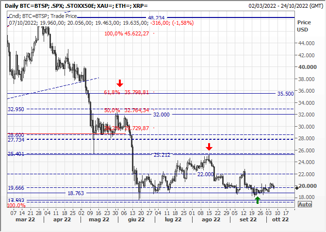Scenario grafico di breve-medio periodo. Il Bitcoin ora scambia a 19.640 usd, -2,1% (+2% a 7 giorni). Dai minimi del 2020 in zona 3.850 usd è arrivato a segnare un record assoluto a 69.000 usd a fine 2021, superando anche se di poco quello di aprile 2021 in zona 65mila punti. Il deciso ritracciamento successivo ha riportato le quotazioni sull'importantissima zona spartiacque 20.000/17.500 usd: il primo rimbalzo non è riuscito ad andare oltre area 25mila punti, parte bassa del target potenziale che avevamo indicato (25.400/32.000 punti). Questa dinamica up&down si sta ripetendo come noi ci aspettavamo. Nel medio-lungo periodo restiamo invece molto più cauti.