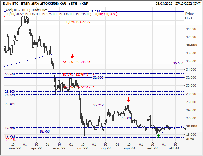 Scenario grafico di breve-medio periodo. Il Bitcoin ora scambia a 19.388 usd, -0,5%. Dai minimi del 2020 in zona 3.850 usd è arrivato a segnare un record assoluto a 69.000 usd a fine 2021, superando anche se di poco quello di aprile 2021 in zona 65mila punti. Il deciso ritracciamento successivo ha riportato le quotazioni sull'importantissima zona spartiacque 20.000/17.500 usd: il primo rimbalzo non è riuscito ad andare oltre area 25mila punti, parte bassa del target potenziale che avevamo indicato (25.400/32.000 punti). Questa dinamica up&down si sta ripetendo come noi ci aspettavamo. Nel medio-lungo periodo restiamo invece molto più cauti.
