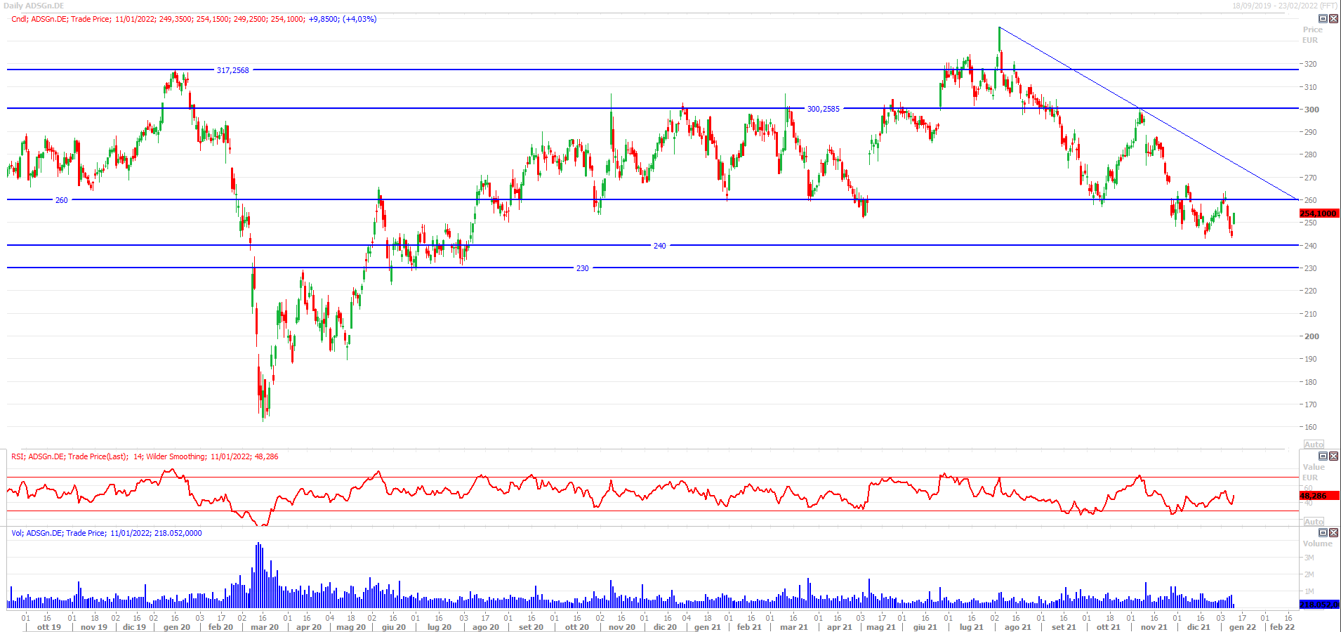 Scenario grafico di breve-medio periodo. Adidas, ora a 254 euro, +4%, sta mettendo sotto forte pressione la base della consolidata banda 243/250 - 300/336 euro: in caso di confermata rottura, nostro scenario base, ci sarà un'accelerazione ribassista almeno fino a 230 euro.266.32825