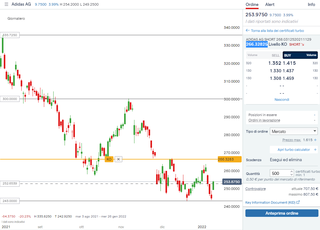 TRADING Turbo24 - SHORT su ADIDAS con Knock Out a 266,36865 euro