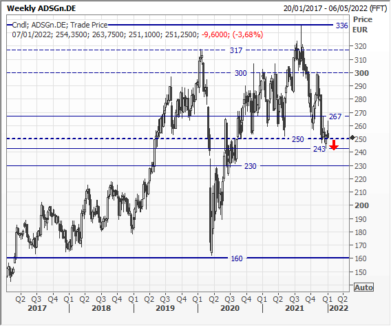 Scenario grafico di breve-medio periodo. Adidas, ora a 251,2 euro, -3,6%, sta mettendo sotto forte pressione la base della consolidata banda 250 - 300/336 euro: in caso di confermata rottura, nostro scenario base, ci sarà un'accelerazione ribassista almeno fino a 230 euro.