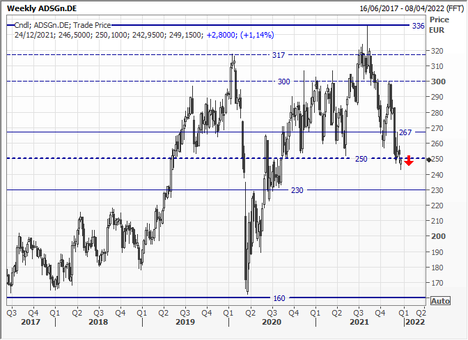 Scenario grafico di breve-medio periodo. Adidas, ora a 249 euro, +1,1%, sta mettendo sotto forte pressione la base della consolidata banda 250 - 300/336 euro: in caso di confermata rottura, nostro scenario base, ci sarà un'accelerazione ribassista almeno fino a 230 euro.