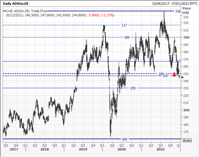 Scenario grafico di breve-medio periodo. Adidas, ora a 245 euro, -3%, sta mettendo sotto forte pressione la base della consolidata banda 250 - 300/336 euro: in caso di confermata rottura, nostro scenario base, ci sarà un'accelerazione ribassista almeno fino a 230 euro.