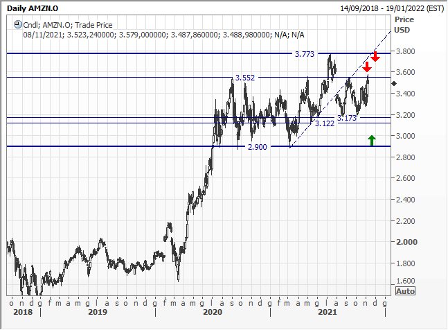 Scenario grafico di breve-medio periodo. Amazon, ora nel pre-market a 3.489 usd, invariato, è imbrigliata in una banda di oscillazione dal terzo trimestre del 2020. Infatti, nonostante i top assoluti siano stati segnati a 3.773 usd lo scorso luglio, i prezzi di fatto oscillano da tempo nella banda 2.900-3.550 usd. Ci attendiamo il ritorno dei prezzi sulla base della stessa banda.