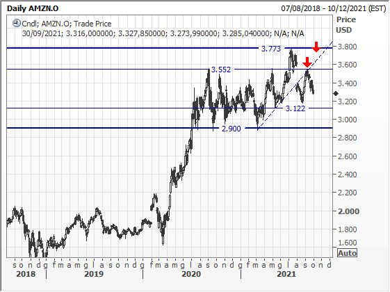 Scenario grafico di breve-medio periodo. Amazon, -0,7% nel Pre-market a 3.261 usd (-0,1% a 3.283 usd, chiusura di venerdì), è imbrigliata in una banda di oscillazione dal terzo trimestre del 2020. Infatti, nonostante i top assoluti siano stati segnati a 3.773 usd lo scorso luglio, i prezzi di fatto oscillano nella banda 2.900-3.550 usd. Ci attendiamo nuovamente il calo dei prezzi verso la base della stessa.