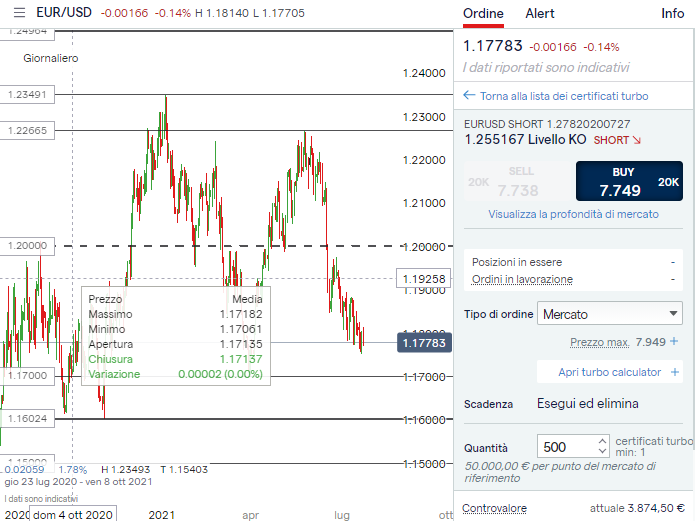 TRADING Turbo24 - SHORT su EUR/USD con Knock Out a 1,255167