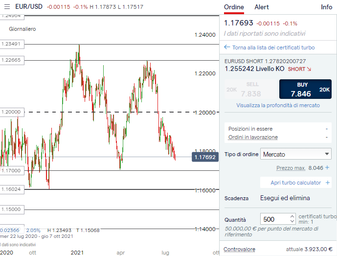 TRADING Turbo24 - SHORT su EUR/USD con Knock Out a 1,255242
