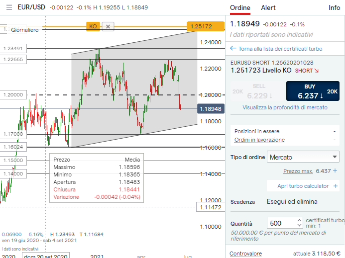 TRADING Turbo24 - SHORT su EURUSD con Knock Out a 1,251723 punti