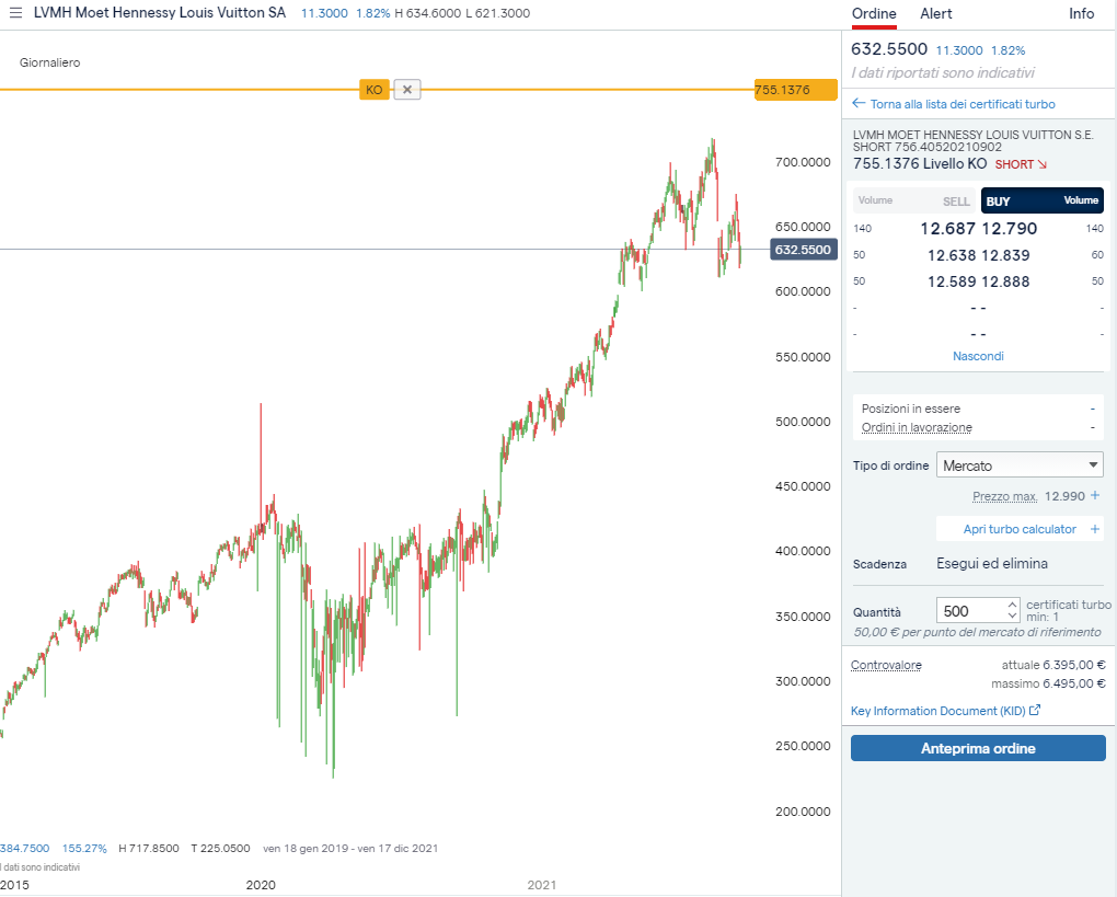 TRADING Turbo24 - SHORT su LVMH con Knock Out a 755,1376 eur